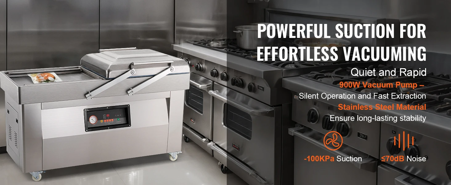 Our chamber vacuum sealer has a powerful motor for quick suction. Made from durable stainless steel, it ensures long-lasting performance. With a suction strength of 100KPa, it handles all your packaging needs effortlessly. It operates quietly at just 70dB, creating a calm workspace.