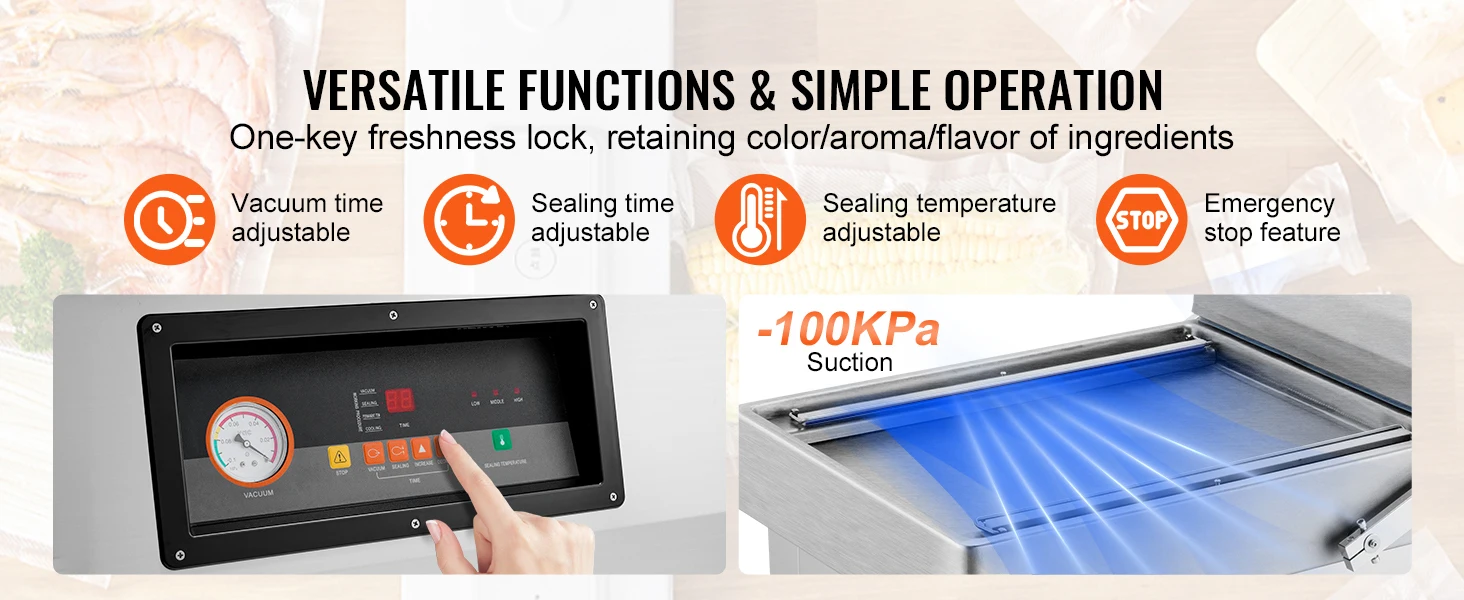 • Multi-Functional Design: Apart from delivering a premium vacuum effect, this vacuum chamber machine also comes with multiple practical features, making food preservation more convenient. Its adjustable cooling time ensures rapid cooling of sealed items for freshness. More handy features like emergency stop, start, and marinating meet different user needs.
