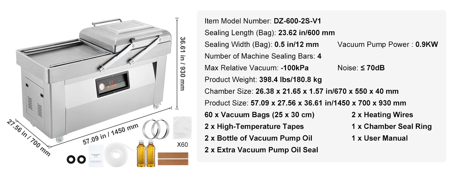 • Premium Vacuum Effect: With a powerful motor boasting a max 4510W power and a max relative vacuum of -100KPa, our chamber vacuum sealer ensures a strong vacuum effect. Featuring a chamber size of 26.38 x 21.65 x 1.57 in/670 x 550 x 40 mm, 23.62 in/600 mm sealing length (bag), and 1200W sealing power, it keeps your food fresh and flavorful. Plus, it operates quietly at less than 70 decibels.